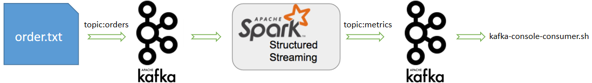 我们使用一个shell脚本发送股票交易数据给Kafka orders主题。Spark结构化流处理程序将从这个主题读取交易数据并将计算出的结果写到另一个Kafka metrics主题。然后我们将使用Kafka的kafka-console-consumer.sh脚本来接收并显示结果。处理流程如下图所示: