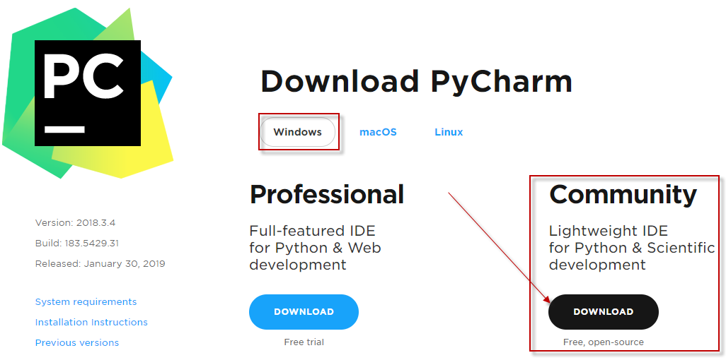 1、首先去Pycharm官网,下载PyCharm安装包(去官网下载),根据自己电脑的操作系统进行选择。PyCharm分为收费的企业版和免费的社区版。开发PySpark应用程序,使用社区版即可。对于windows系统选择下图的框选的安装包。