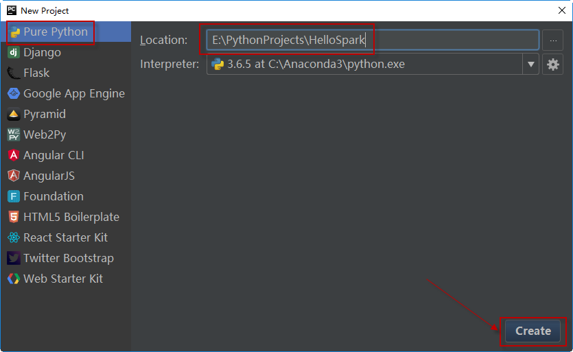 要创建一个新的项目,首先启动PyCharm,选择File > New Project,选择Pure Python,并在右侧指定项目代码所在的位置,将项目命名为HelloSpark。单击Create按钮创建此项目。