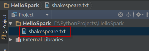 在本地文件系统,将shakespeare.txt拷贝到项目的根目录下,比如~/PythonProjects/HelloSpark。如下图所示: