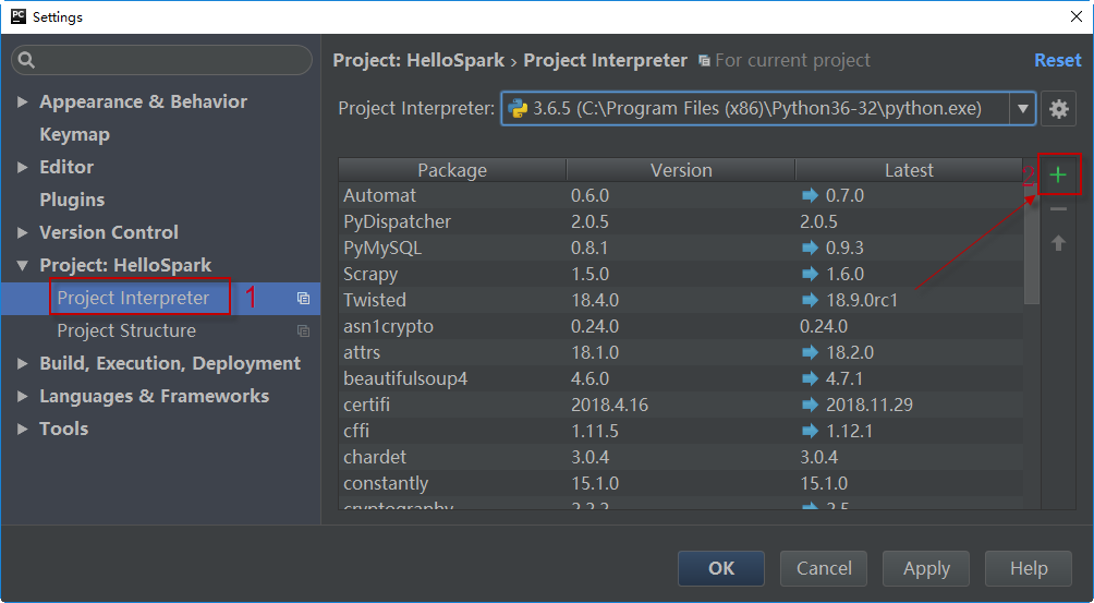 在项目设置面板中,选择左侧的Project:HelloSpark > Project Interpreter,然后在右侧单击右边栏的绿色+按钮: