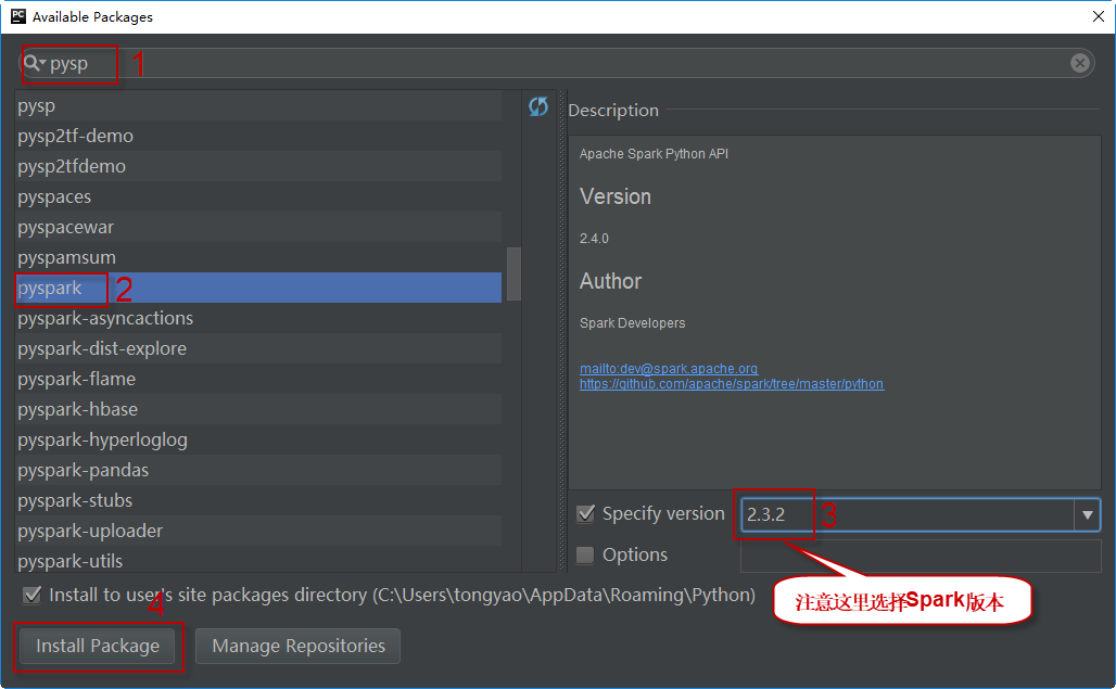 在上方的搜索框内输入pyspark,搜索并选择pyspark,然后的面板右侧选择指定的版本(说明:虽然截图中显示版本是2.3.2,实际上本书所有示例使用的Spark版本均是基于3.1.2),最后单击单击Install Package按钮安装。如下图所示: