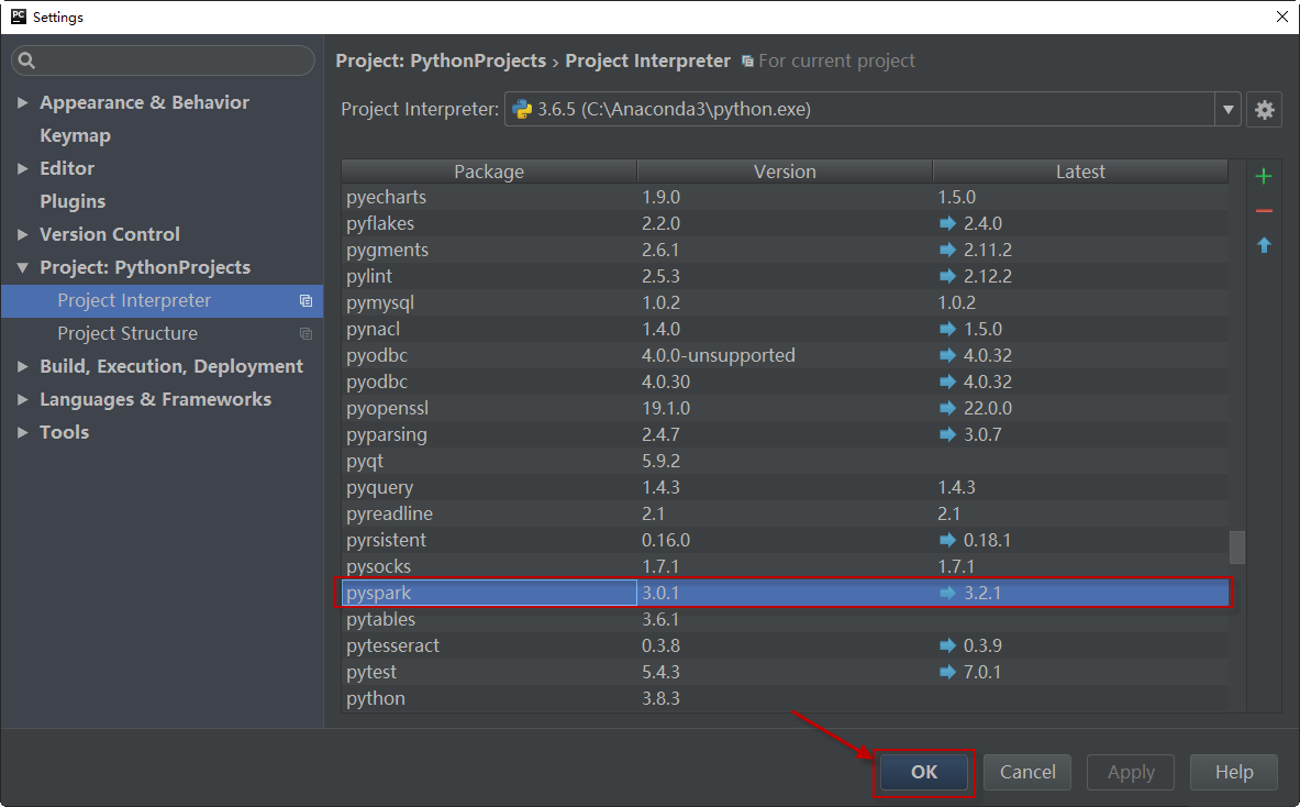 安装完毕,关闭此面板,回到settings界面,可以看到pyspark已经安装成功。单击OK按钮即可。