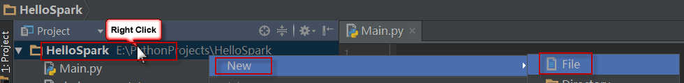 在刚创建的HelloSpark项目目录上,单击右键,选择New > File,创建一个新的Python源文件,并命名为Main.py。