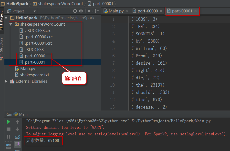 程序计算结果保存在shakespeareWordCount文件夹中,该文件夹与源代码的文件夹位于相同的目录下。如下图所示: