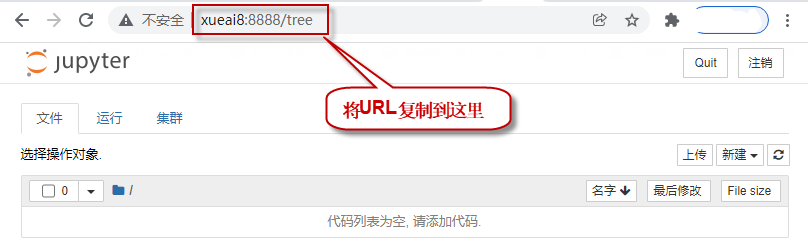 4)在Windows下,通过浏览器访问Jupyter。到Windows下,打开浏览器,粘贴上一步复制的URL,回车访问,打开notebook页面。如下图所示: