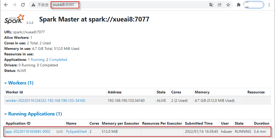 6)查看Spark Web UI。另打开一个浏览器窗口,访问http://xueai8:8080。如下图所示: