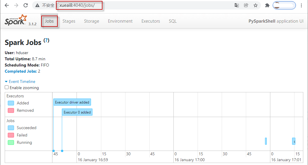 7)查看正在执行的Spark作业的Web UI。另打开一个浏览器窗口,访问http://xueai8:4040,可以看到正在执行和已经执行完成的作业情况。如下图所示: