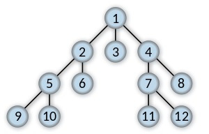 广度优先算法的遍历顺序为:1->2->3->4->5->6->7->8->9->10->11->12,如下图所示。
