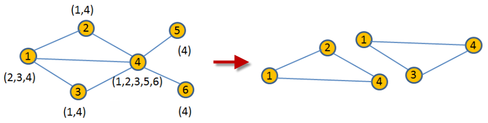 网络中的每个节点最初都被分配给它自己的社区。在每个superstep中,节点将它们的社区从属关系发送给所有邻居,并将它们的状态更新为传入消息的模式社区从属关系。