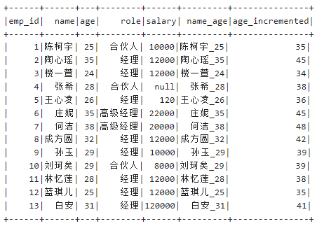 (13, "白安",31))).toDF("emp_id","name","age")