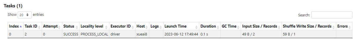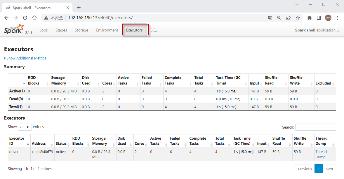 Executors选项卡显示了为应用程序创建的执行器的摘要信息,包括内存和磁盘使用情况以及任务和随机信息。“Storage Memory”列显示用于缓存数据的已使用和预留的内存量。