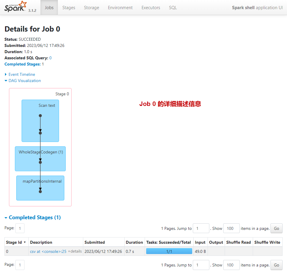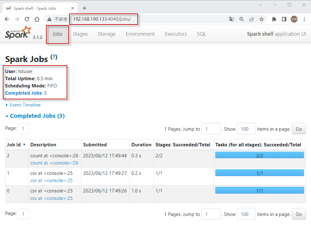在上面的应用程序中,我们执行了3个Spark作业(0,1,2):