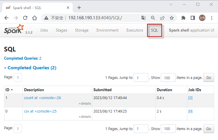 如果应用程序执行Spark SQL查询,那么SQL选项卡将显示信息,例如查询的持续时间、Spark作业以及物理和逻辑计划。