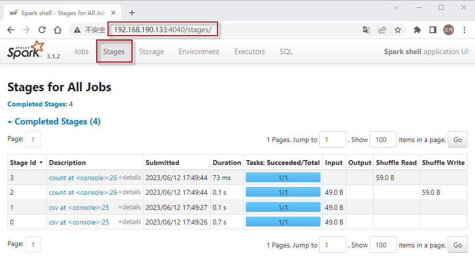 (2)在Spark Job选项卡的顶部选择Stages选项(显示应用程序中的所有阶段)。