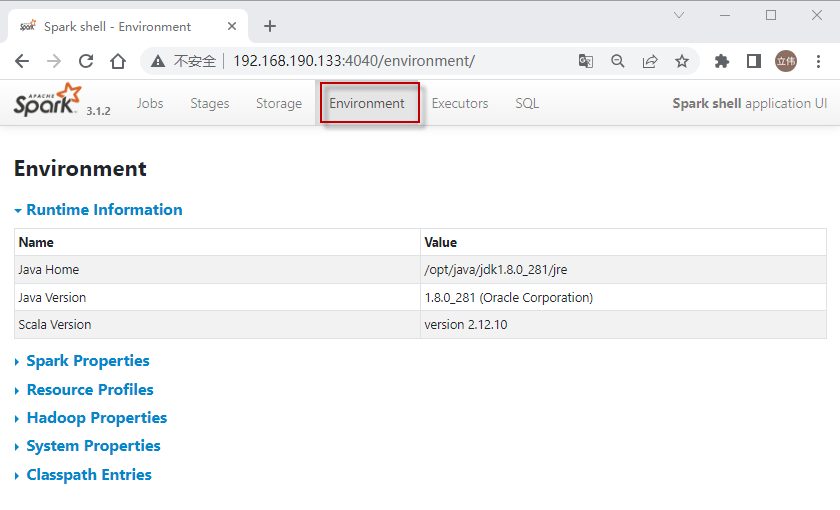 Environment选项卡显示不同环境和配置变量的值,包括JVM、Spark和系统属性。这是检查属性设置是否正确的有用地方。