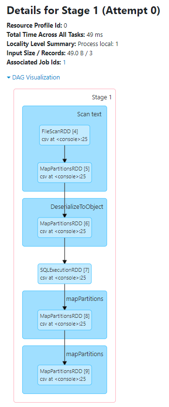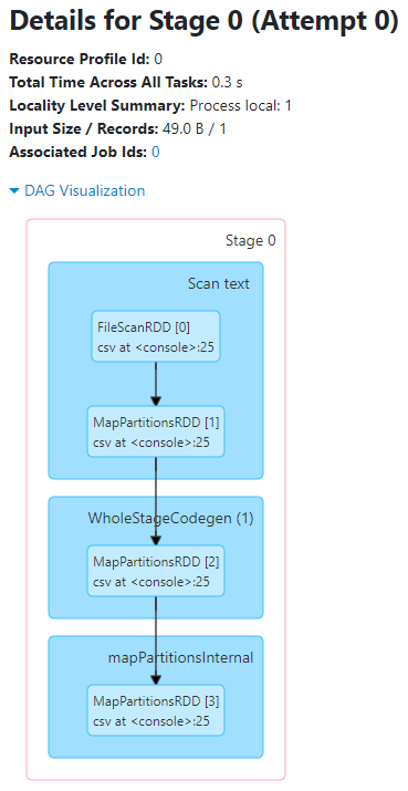 Stage(阶段)的细节展示了该阶段的有向无环图(DAG),其中顶点表示RDD或DataFrame,边表示要应用的操作。