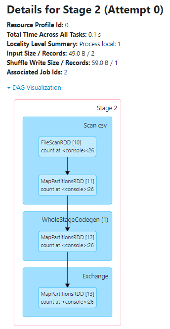 每个宽转换产生一个单独的Stages数量。在我们的例子中,Spark job0和Spark job1有单独的单个Stage,但是当涉及到Spark job 3时,我们可以看到两个Stages,因为数据分区。默认情况下,数据被划分为两个文件。