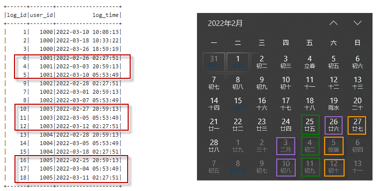 +------+-------+-------------------+ |log_id|user_id| log_time| +------+-------+-------------------+ | 1| 1000|2022-03-10 10:08:13| | 2| 1000|2022-03-18 10:33:22| | 3| 1000|2022-03-26 18:59:19| | 4| 1001|2022-03-03 20:59:13| | 5| 1001|2022-03-10 05:53:49| | 6| 1001|2022-02-26 02:27:51| | 7| 1002|2022-03-01 20:59:13| | 8| 1002|2022-03-07 05:53:49| | 9| 1002|2022-02-28 02:27:51| | 10| 1003|2022-02-27 20:59:13| | 11| 1003|2022-03-05 05:53:49| | 12| 1003|2022-03-12 02:27:51| | 13| 1004|2022-02-28 20:59:13| | 14| 1004|2022-03-05 05:53:49| | 15| 1004|2022-03-18 02:27:51| | 16| 1005|2022-02-25 20:59:13| | 17| 1005|2022-03-04 05:53:49| | 18| 1005|2022-03-11 02:27:51| +------+-------+-------------------+